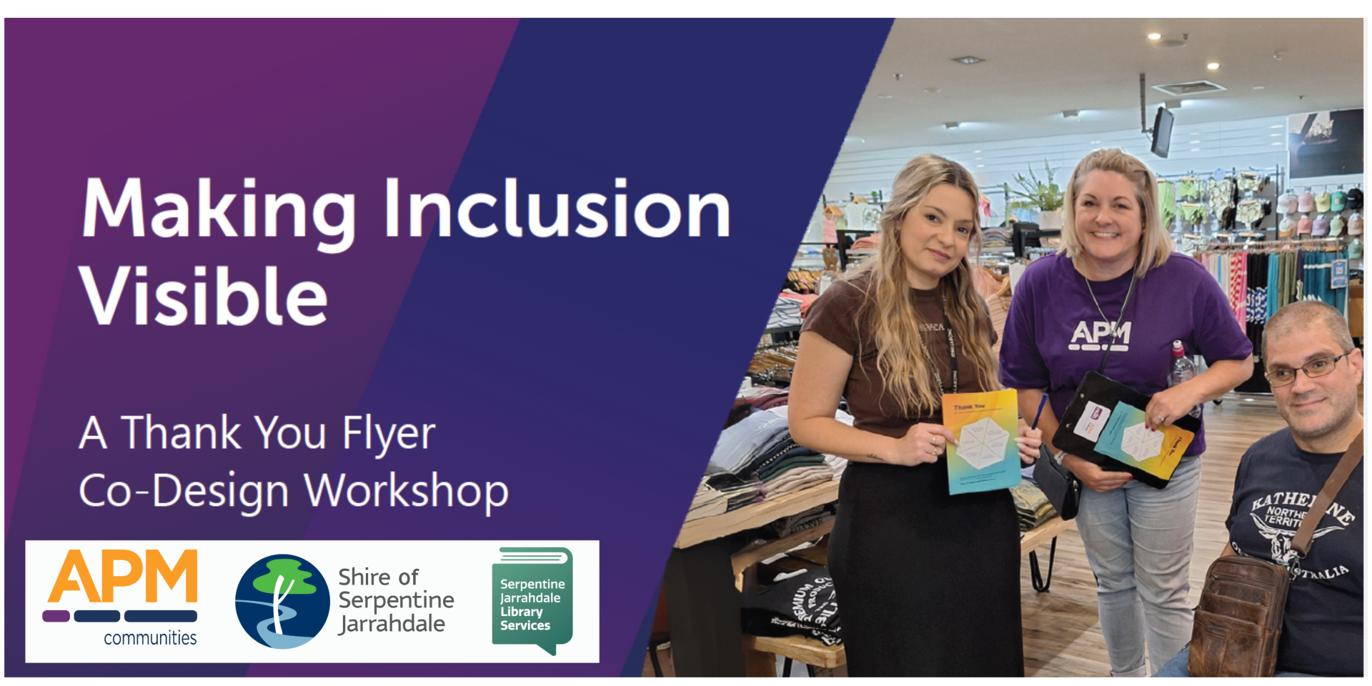 As part of the event, APM Communities will host the “Making Inclusion Visible” Co-Design Workshop – a fun and meaningful session where participants will help design a flyer for a local Thank You Campaign. This campaign uses gratitude to start conversations with local businesses about accessibility and inclusion.