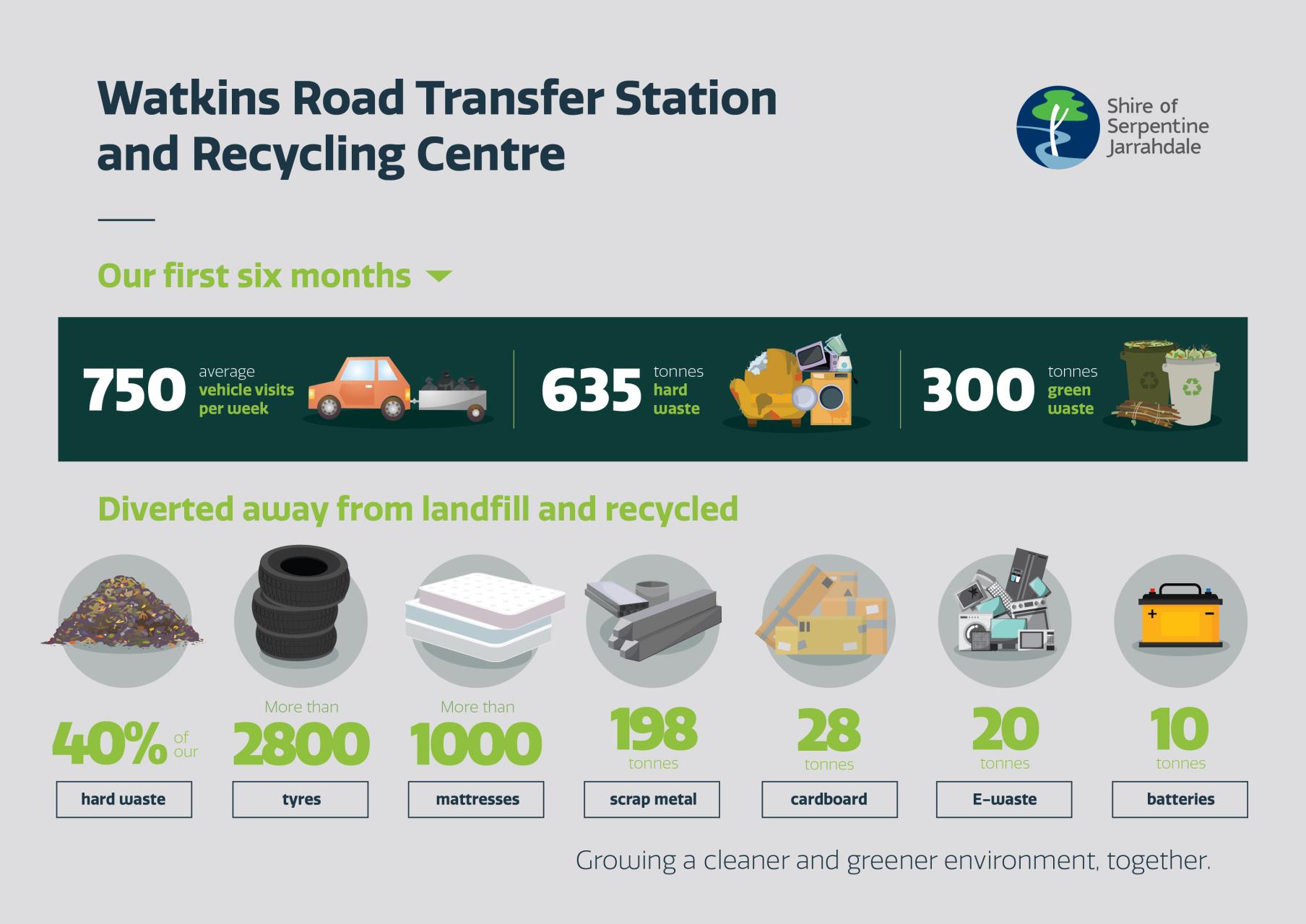 Serpentine Jarrahdale residents have embraced the Shire’s new Watkins Road Waste Transfer Station and Recycling Centre, with an average of 750 vehicles accessing the facility each week in its first six months of operation.